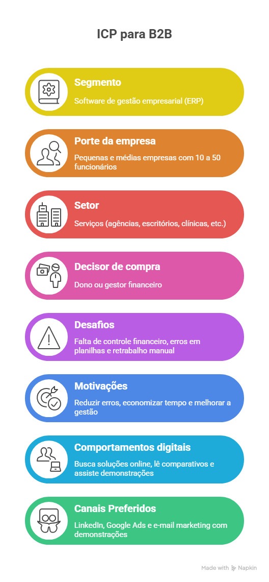 O ICP define o tipo de empresa ou cliente com maior chance de gerar valor: segmento, porte, localização, ticket médio, entre outros fatores objetivos.