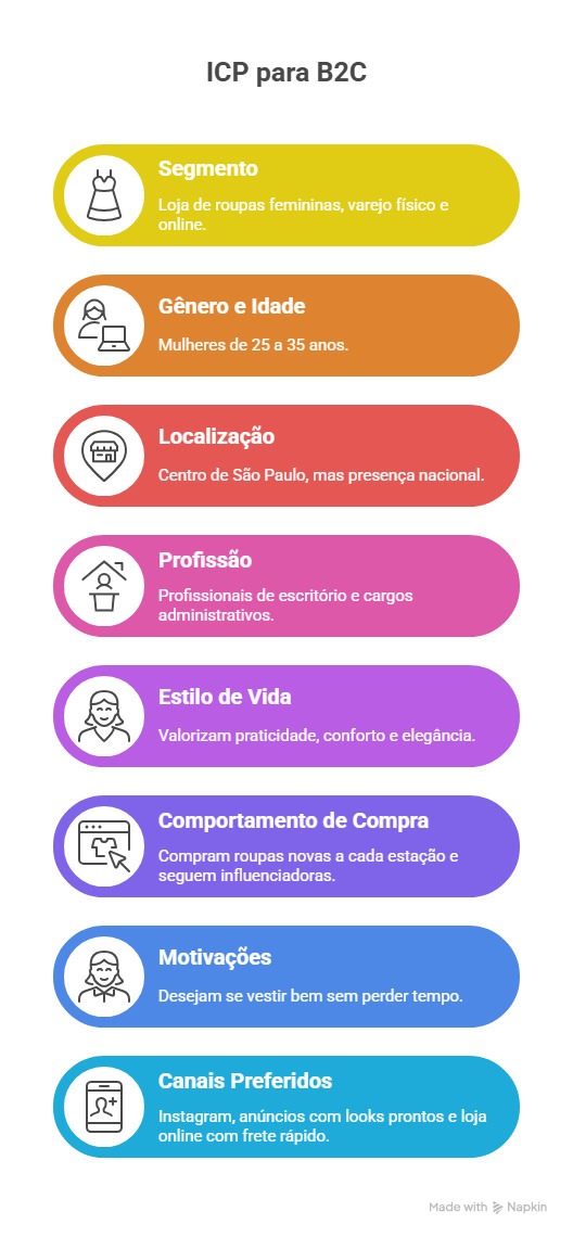 Considere uma loja de roupas que vende tanto em loja física quanto online. Em vez de mirar “mulheres entre 18 e 50 anos”, um campo muito vasto, o ICP da marca poderia ser definido da seguinte forma: